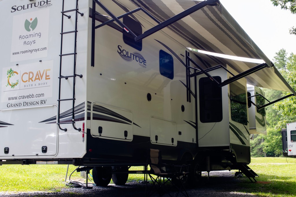 A drive through winding and hilly roads shaded by mature trees and lined with interesting white magnolia-like flowering shrubs leads you to the park entrance which displays in the backdrop of a ranger station, a large river flowing over man made steps down into a stream. Signs direct you through a magical forest of Fraser Fir, Mountain Ash and Red Oak trees dominating over mosses and large ferns to the campground check in store. The store offers snacks, drinks, ice cream, souvenirs and small RV accessories along with firewood. The roads, sites and grounds are very well maintained. The bathrooms and showers were better than most I have seen and there is one washer and drier available. Some sites are separated by trees and vegetation while others are more out in the open but all are far enough apart for good privacy. Loop 1 offers electric while loop 2 contains non-electric sites. No sewer connections offered but a Dump Station is available. The weather in July was wonderful; mostly in the 80s Fahrenheit range. We spent spent many evenings sitting out watching displays of flickering light shows put on by abundant fire-flies. Rita and I enjoyed a few short explorations of the wooded trail right off of our campsite. Walks around loop 1 were enjoyable due to the tree and fern filled median and forested sites providing plenty of shade and interesting scents for our black furry four-legged friend Rita.
