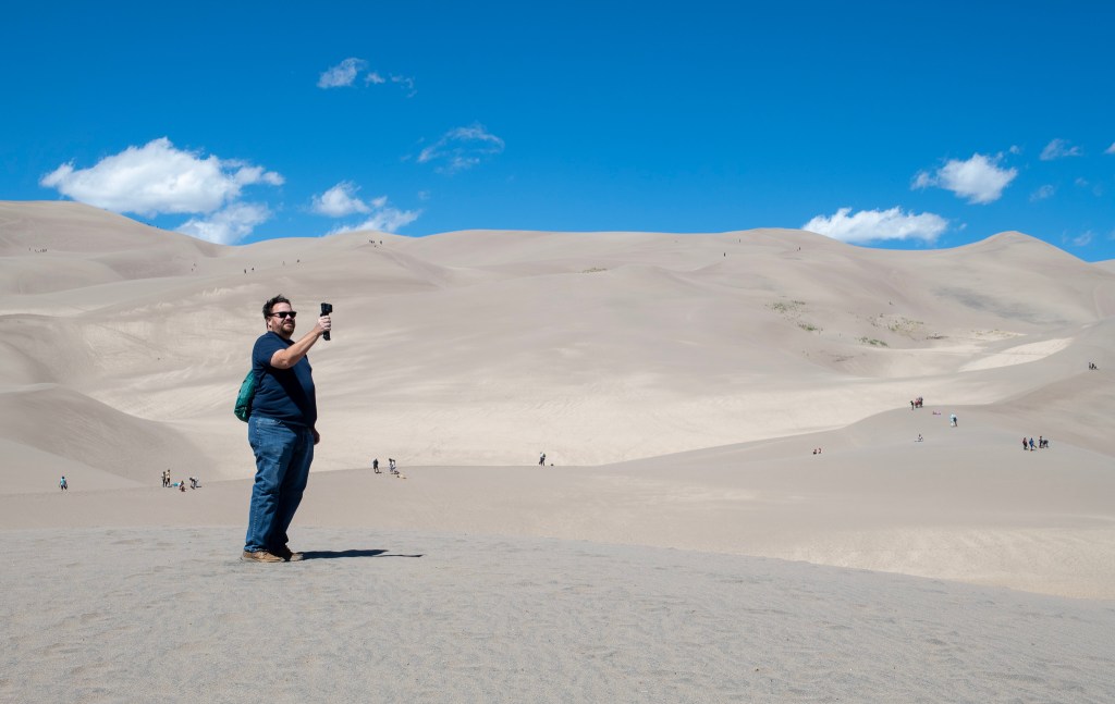 On our second visit during the day, we decided to give it a go at hiking the dunes and sand sledding down. We didn’t realize that sand boards and sleds had to be rented in town before heading to the park but decided to have a good time anyway. Near the park entrance is a Store named Oasis open seasonally also offering sand board rentals. At the visitors center the ranger recommended we head on over to the Dunes so that we could finish up by 1:00 p.m. as the sand reaches up to 150 degrees Fahrenheit and the high winds begin. We made it up to the shortest dunes on the first ridge before the winds began kicking up and headed out. High Dune on First Ridge offers a view of the entire dune field, is 2.5 miles round trip and has an elevation gain of 693 feet. Star Dune, one of the tallest dunes in North America is 6 miles roundtrip and has an elevation gain of 741 feet. Walking on top of ridges makes the hike easier. The park elevation ranges from 7500 to ~ 14000 feet above sea level so be mindful of shortness of breath and possible elevation sickness (headache, nausea, and short breath). Being low elevation east coasters, we would easily become short of breath while walking and hiking. Taking short breaks and drinking plenty of water helped. The 7-day pass entrance fee is 25.00 or you can purchase an interagency annual pass for 80.00 if you plan on visiting other national parks.