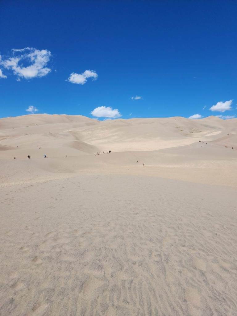 We decided to take in the milky way view while there was opportunity being that Great Sand Dunes is a certified International Dark Sky Park. On our first visit we hiked in from the picnic parking lot just after it had gotten dark with our snack/med bag over shoulder, towel under arm and dog Rita on leash ready for nature’s live performance and unprepared without a red flashlight. We used our cell phone lights which is not recommended due to our humanly slow pupil response to light changes and unmarked entrance/exit from parking lot. We crossed Medano Creek which during September is a very shallow stream of slow-moving water and placed our towel farther up on dry sand. Being that it was a relatively moonless night during the end of summer we were able to see the brightest part of the milky way. Nature’s performance did not disappoint! If you plan on visiting at night make sure to bring coats or jackets as temperatures can dip to 42 degrees Fahrenheit.