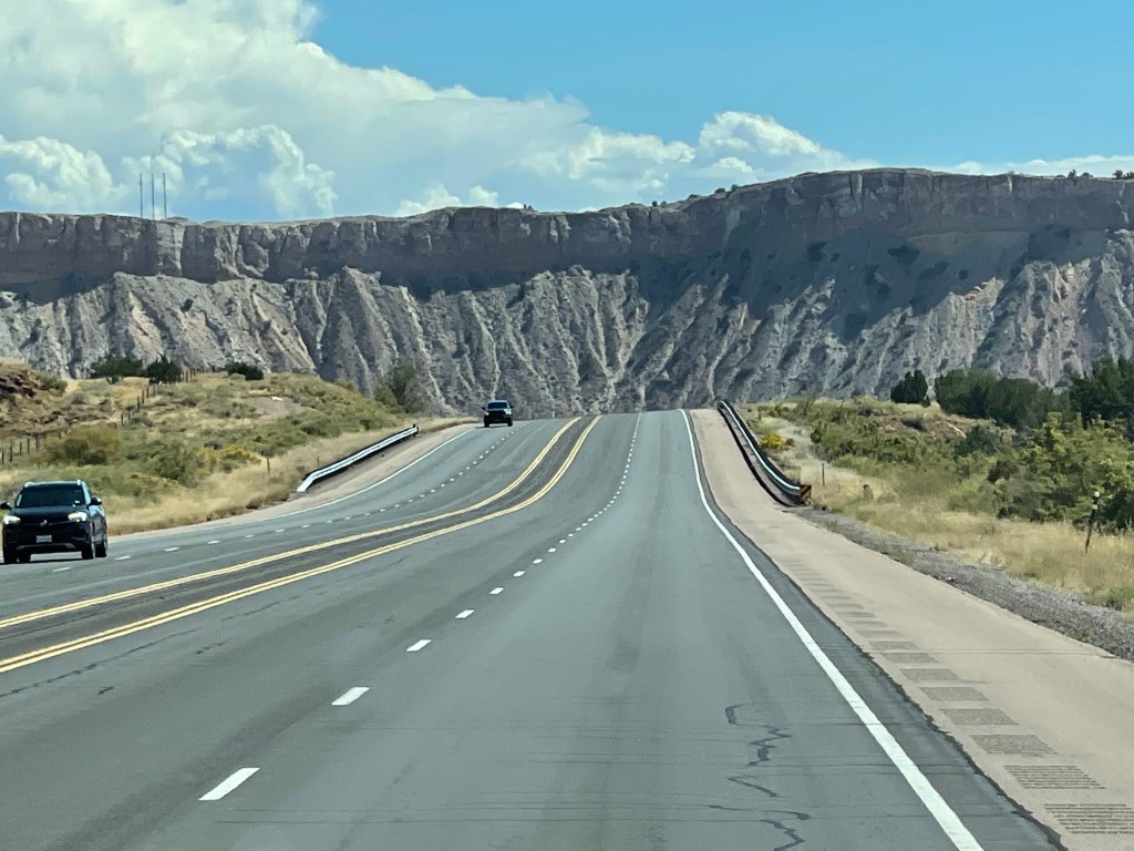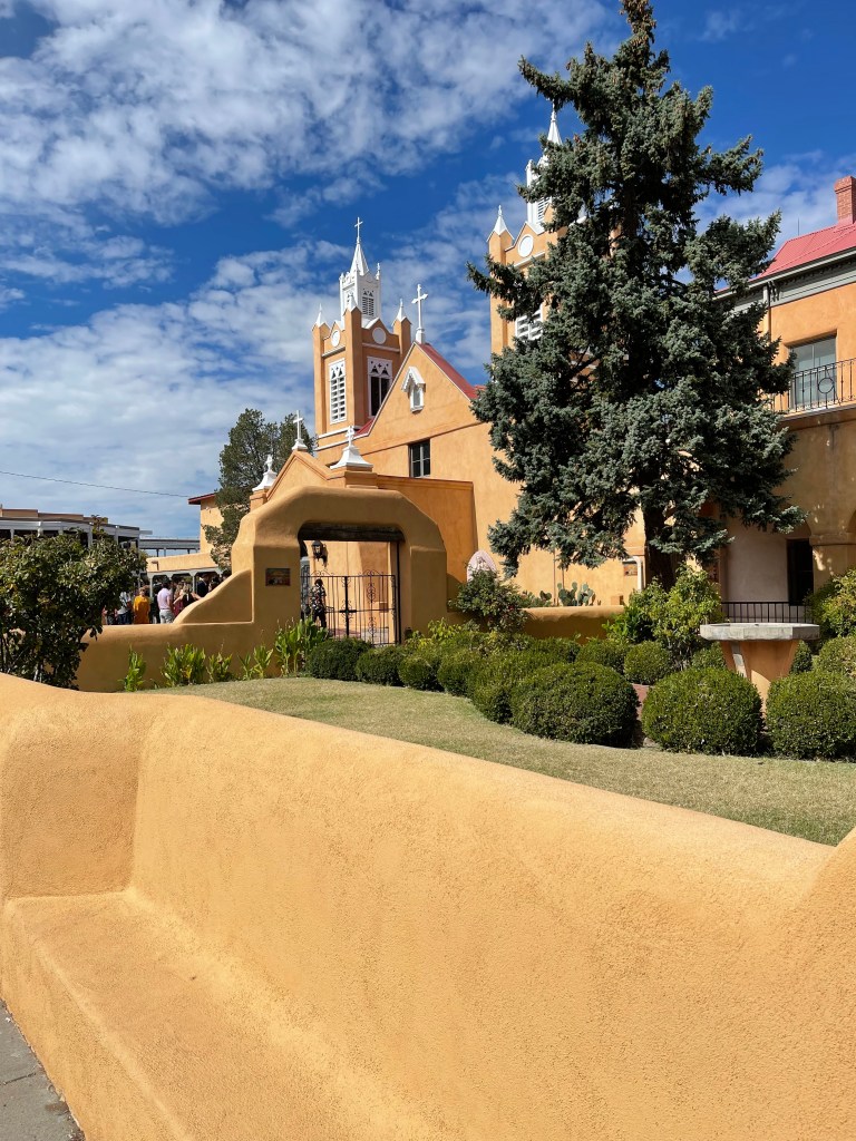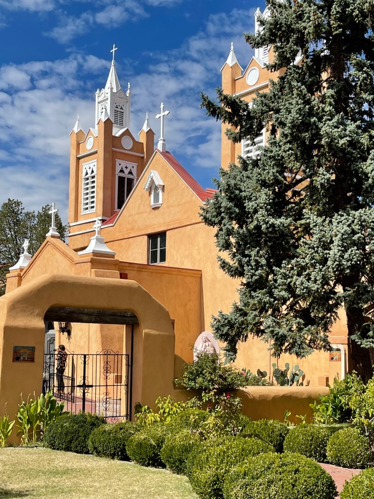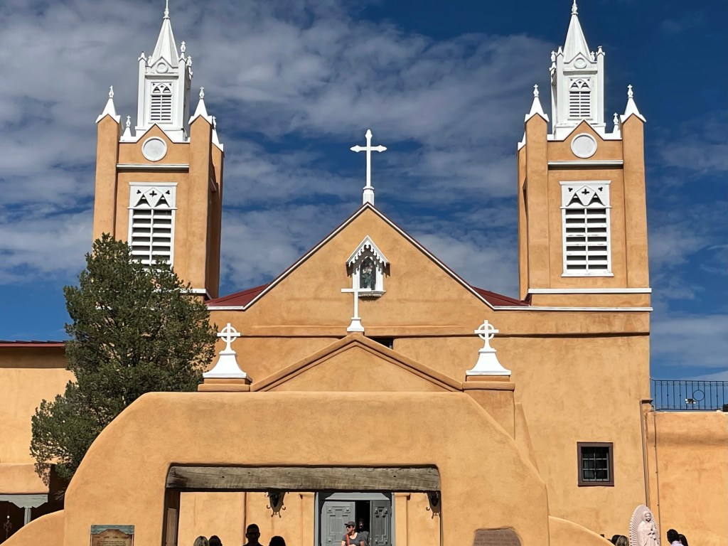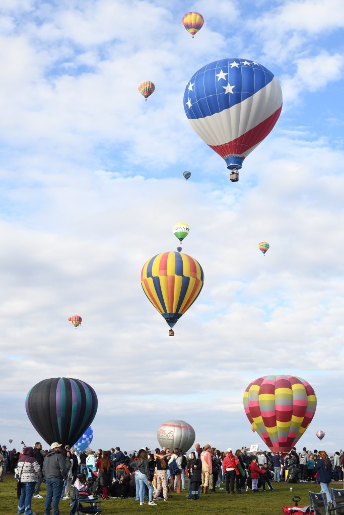 From Colorado into New Mexico highways blanketed in big blue skies bordering rolling tumbleweeds and desert bushes lead into rock formations made of colorful horizontally striped variations of sandstone, varied elevations, pockets of alpine forests or some combination of such. The beauty of the drive quickly becomes an existential experience overwhelming any destination goals. If Albuquerque isn’t currently one of your destinations, you may want to consider it. It’s a city much like any other city except for its distinct culture, food and magical places. Pueblos who settled the area during the 13th century along with later invading Spaniards have inspired flat roof houses and buildings lined in colorful stucco resembling older adobe mud coverings (1). Thick ornate wooden doors welcome one in at the end of pathways through textured rock gardens sprinkled with desert cacti and maybe a palm or mesquite tree. Compared to the east coast there isn’t a lot of green in Albuquerque but its beauty lies in the Manzano and Sandia Mountains visible from the mid to east side of the city. If you would like to visit the Sandia Peak from Albuquerque the Sandia Peak Ariel Tramway is a good option. The ascend offers excellent views so I am told and takes 15 minutes to reach the top where you can dine at TEN 3 restaurant if you have the appetite. Speaking of appetites and green. Be prepared to have an answer to a common question when dining in the area. Green or Red? If you would like a mix of both chile sauces ask for “Christmas”. I was told the longer the pepper is stored, the hotter it gets. I tried vegetables cooked in green sauce naively assuming green was the safer choice, and was surprised how spicy it was. The flavor was wonderful and then a minute later my mouth felt like a blow torch! Every time I opened it to chat with our dinning friends I imagined spewing out a blue flame. I managed to power through. LOL From then on I asked for Christmas on the side. Albuquerqueians have a great pride for and love of their chile! There is even a yearly Great New Mexico Chile Taste-Off usually in or around October. Chile growers and others bring their recipes from all over New Mexico to Socorro (about an hour outside of Albuquerque) to compete for the “Best Chile” sauce title. If you can’t make it to the chile cook off event the Farmers Chile Market offers many different varieties of chile including the premium hatch chile produced in Hatch Valley. (Note: Hatch chile season is from the beginning of August to the end of September.) If you need a break from spicy fares the Range Cafe in Bernillio is an excellent choice! The country fried steak offered gives the best southern cook “a run for their money”. Move over Ms. Patty! Although you can find the breakfast burrito at many restaurants it is said to have originated at the Balloon Fiesta in the 1970s (2) and is a tasty and filling option if you are attending a morning ascension show.