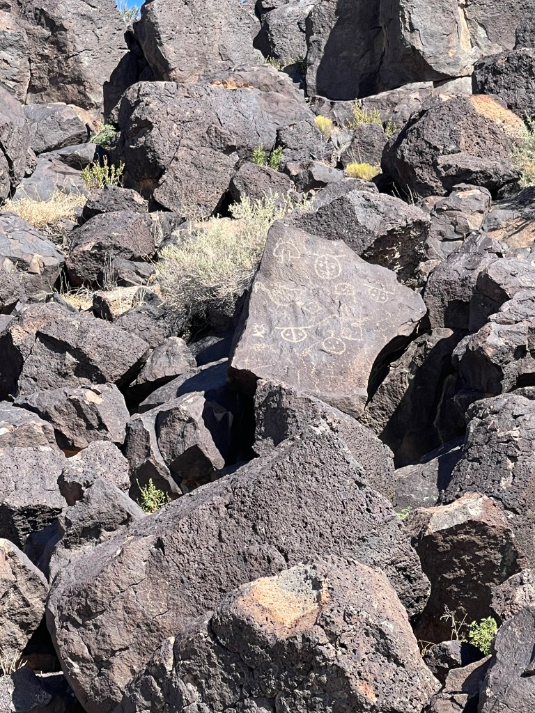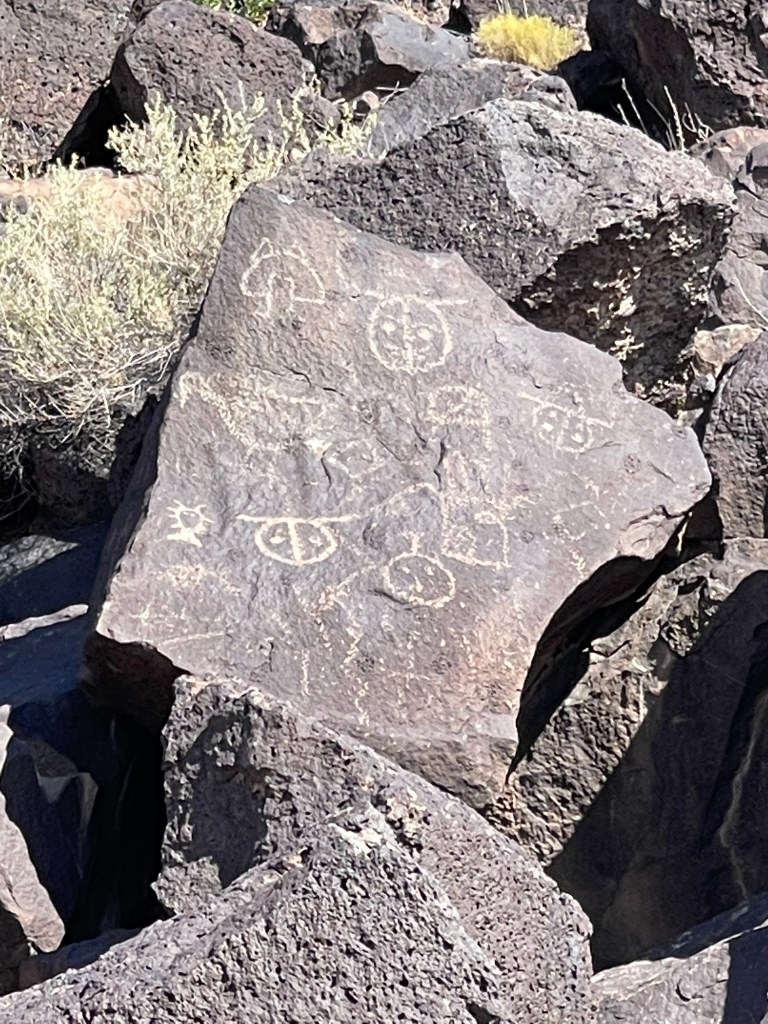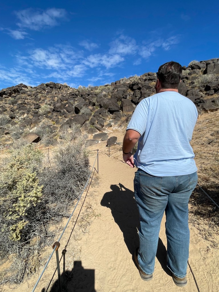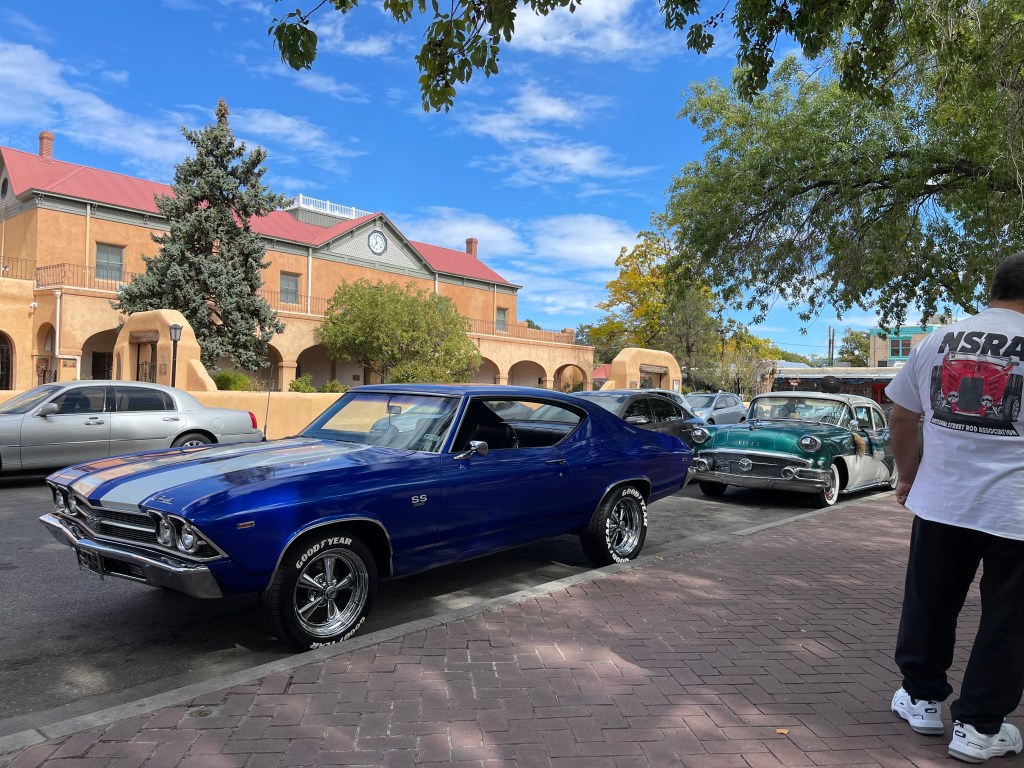 We stayed at the KOA in Bernillio about 20 minutes from the field. Cactus Brewing Company offering beers and surprisingly good food was a five minute walk through the back corner of he park. Best of all we were able to bring our dog Rita and listen to some live music! We would definitely stay here again! The weekend after attending the balloon fiesta we decided to take a short hike on the Piedras Marcadas Canyon Petroglyph Viewing Trail at northern most area of Petroglyph National Monument. It is a 1.5 mile trail with 7 petroglyph viewing areas. Some of the glyphs are quite high and are hard to view without binoculars. Even though we didn’t go prepared we still saw quite a few petroglyphs of all different sizes. There is no shade and in the afternoon it starts getting hot rather quickly. Due to the heat we turned around close to the 5th viewing area and headed back to the truck. Next time we visit we will choose to go early in the morning and bring a light weight umbrella. Take plenty of water and be sure to visit the visitors center to get good historical information and trail recommendations. Pets allowed except on Boca Negra Canyon trail. After our hike we visited Old Town which has quaint shops and interesting architecture. It is a touristy area and can get quite busy on the weekends. While there we delightfully strolled upon a car show displaying old muscle cars. We ventured into a tourist shop, bought the T-shirt and grabbed some pizza for lunch. Would we go there again? We are already planning on it!