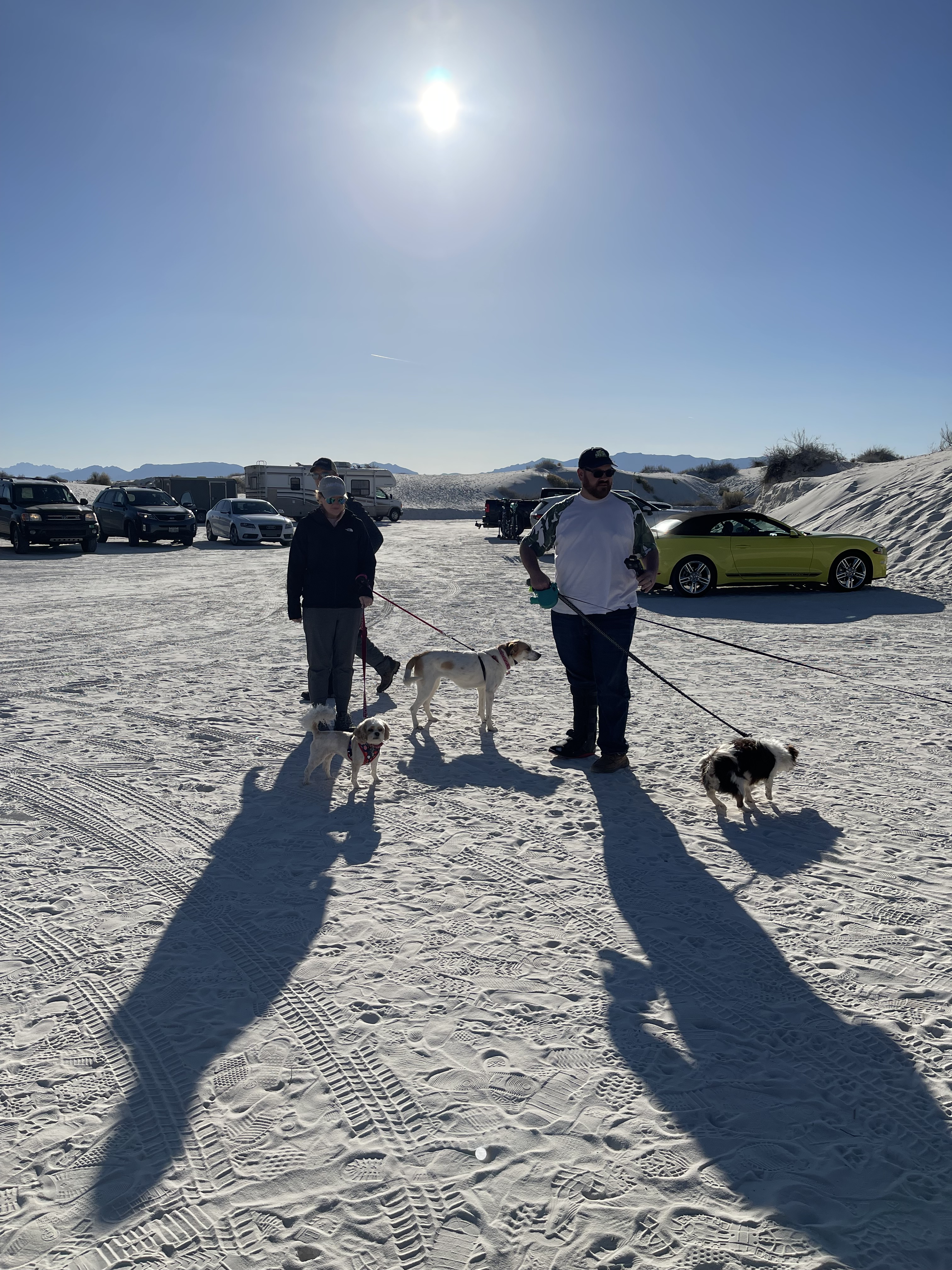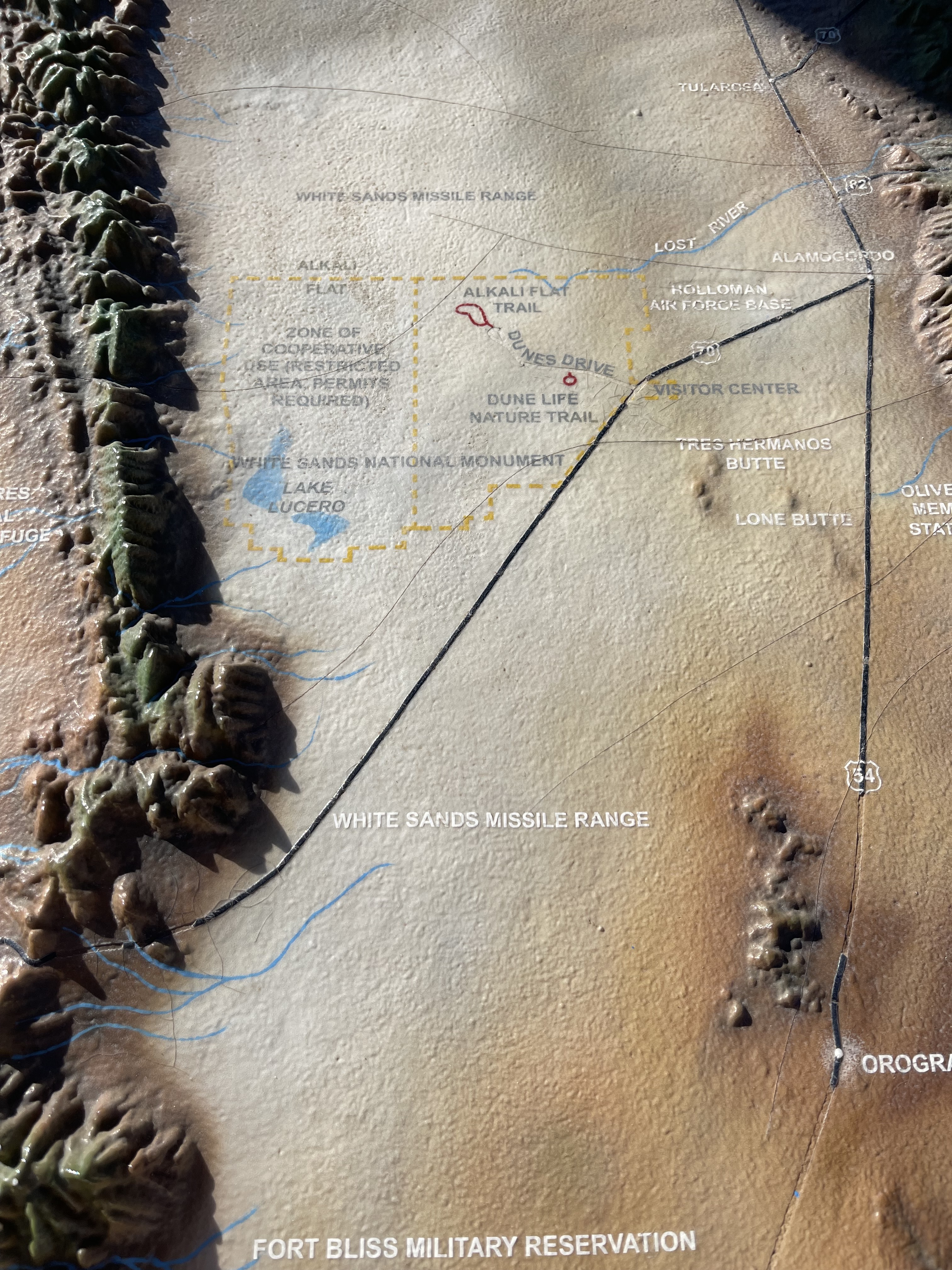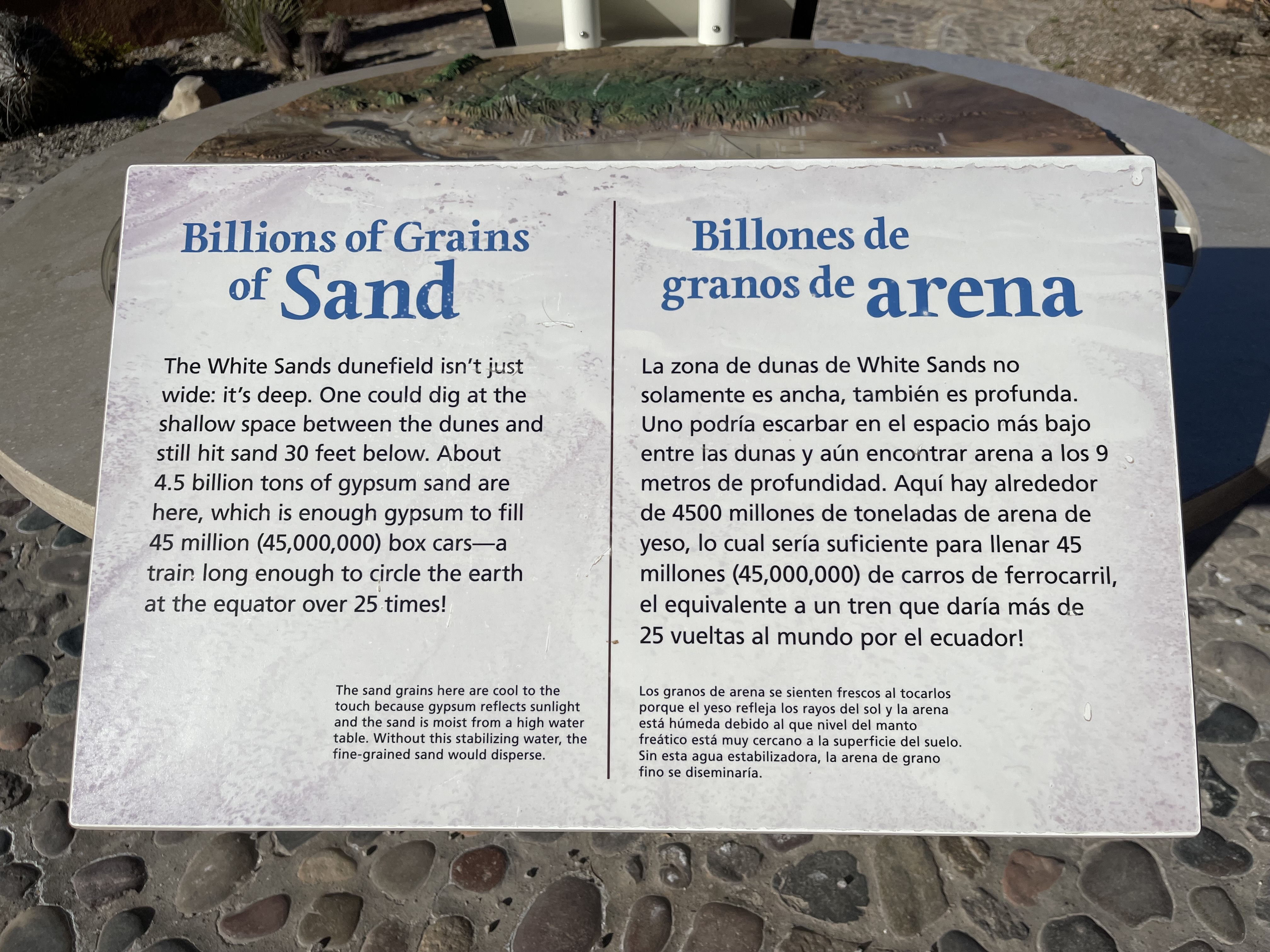 Located in Carrizozo on US Hwy 380 and a just over two hours from Las Cruses, Valley of Fires was created 2,000 to 5,000 years ago from lava flows that originated from vents created by extrusions in the earths thin crust. (1) The flow covers about 44 miles and is over 160 feet thick near the campground there. (1) Over time hearty drought tolerant plants began to grow on the cooled lava flows. Typical Chihuahuan desert plants such as bae grass, banana yuca, mesquite, and creosote can be found growing on the edges of the lava in the soil. (1) Native Americans who lived there before Europeans settled used the hard lava as grinding stones (1). The hardened lava is very sharp, almost black and can cut like glass, therefore, the trail has been built up and paved allowing you to wind through a 1 mile area. There are numbered spots along the trail with information boards for those who are curious. Some are a bit faded so grab a folded information sheet from the billboard as you drive into the park entrance. It lists excellent information for each numbered stop. The trail is dog friendly (We all brought our fur buddies!), easy and short enough for even our senior dog and for “Hobbles” aka Ryan. 🙂 It can be a little high in some areas but not too bad if you have acrophobia like myself; nothing a kind extended hand wouldn’t be able to help you through and lend you a sense of accomplishment. We all had a great time! Valley of Fires Recreation area is a great place for families and curious individuals. After our walk we all stopped to eat our packed lunches under the picnic area and then headed for White Sands.