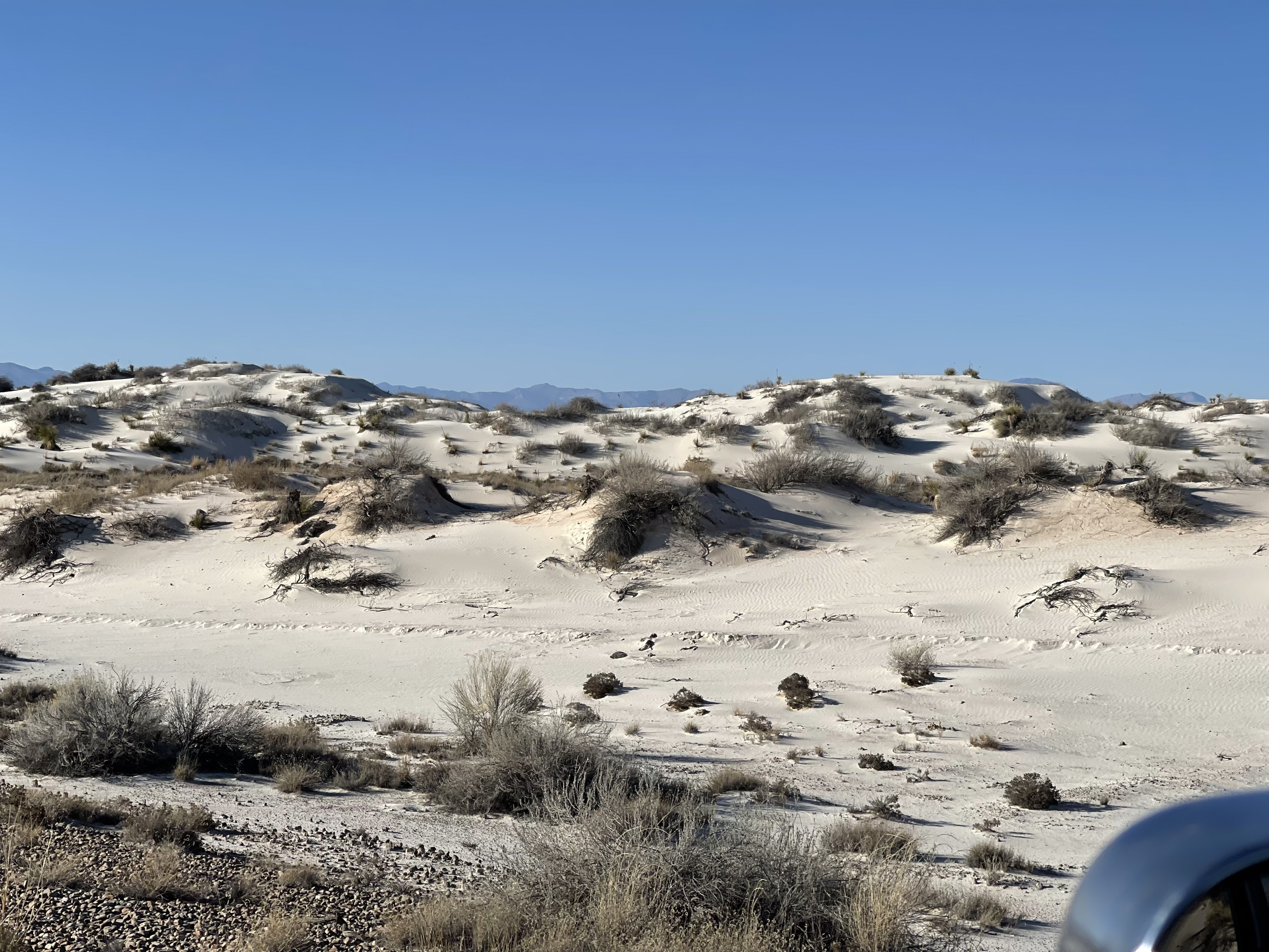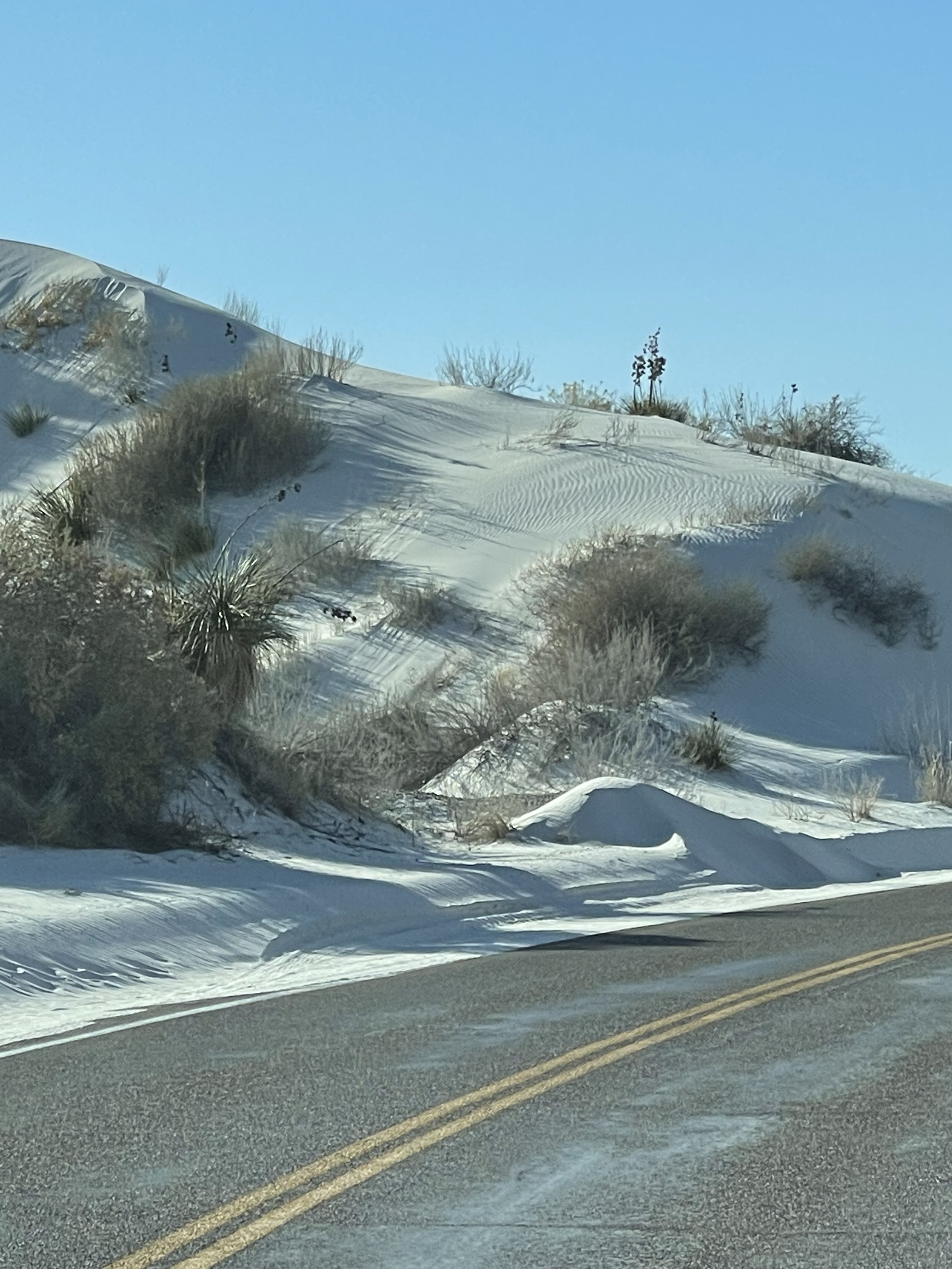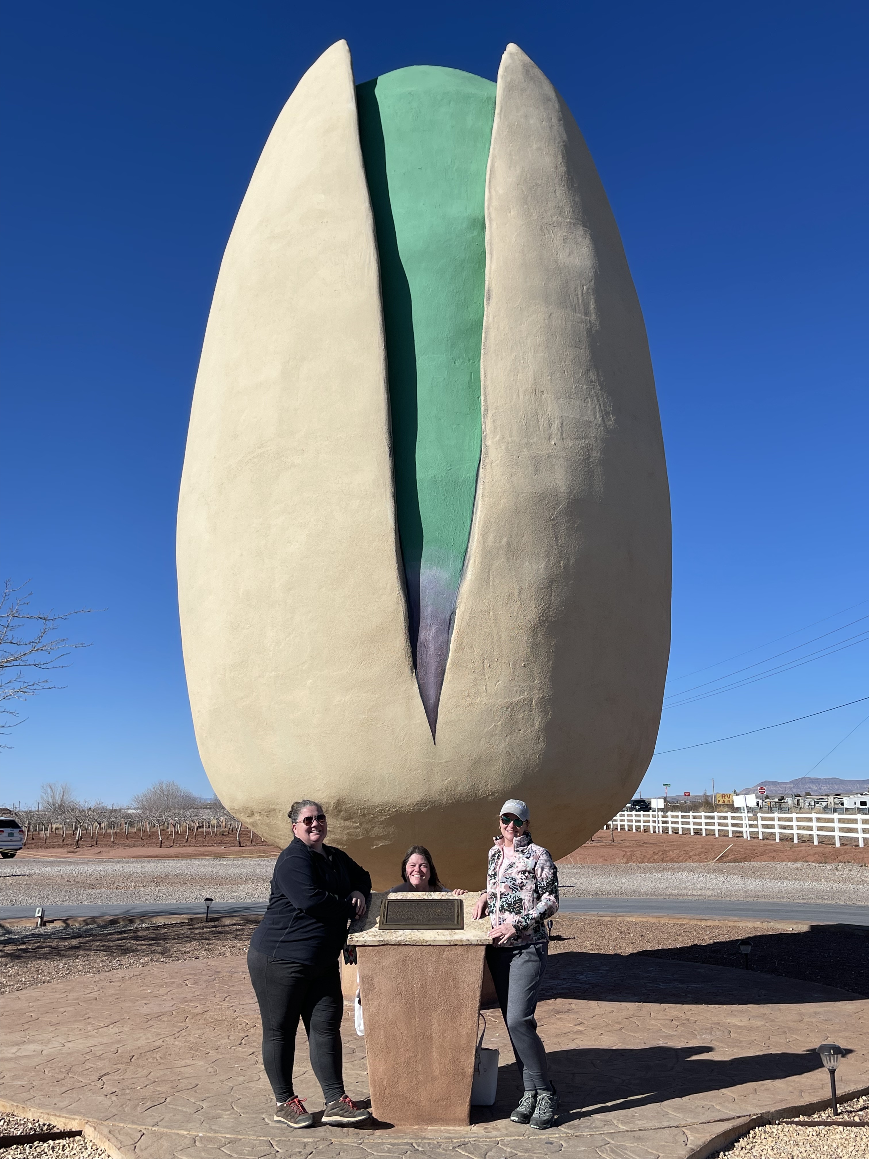 On our way to White Sands we stopped at pistachio land, a touristy building offering all things pistachio among other trinkets and spicy New Mexican fare, located in the middle of a pistachio tree grove. We browsed the shop and then we ladies took a pic in front of the worlds largest pistachio outside. We all hopped in our trucks and resumed the ride to our destination arriving around three in the afternoon.